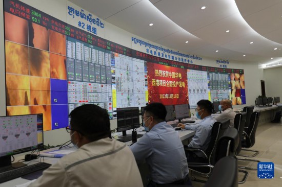 12月16日,工作人员在柬埔寨西哈努克港燃煤电站集控中心工作。