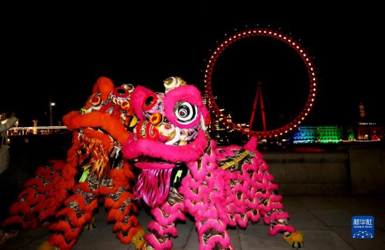 1月13日,在英国伦敦,演员在亮起红色灯光的“伦敦眼”前表演舞狮。