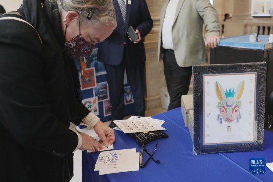 美国邮政总局12日在旧金山亚洲艺术博物馆举行中国农历兔年生肖纪念邮票发行仪式,庆祝即将到来的中国农历新年。