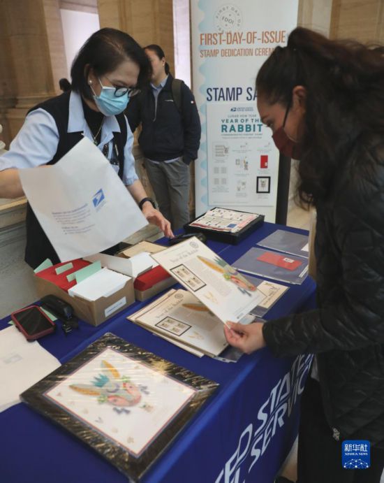 美国邮政总局12日在旧金山亚洲艺术博物馆举行中国农历兔年生肖纪念邮票发行仪式,庆祝即将到来的中国农历新年。