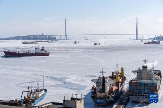 这是1月24日拍摄的俄罗斯符拉迪沃斯托克金角湾冰冻的海面。