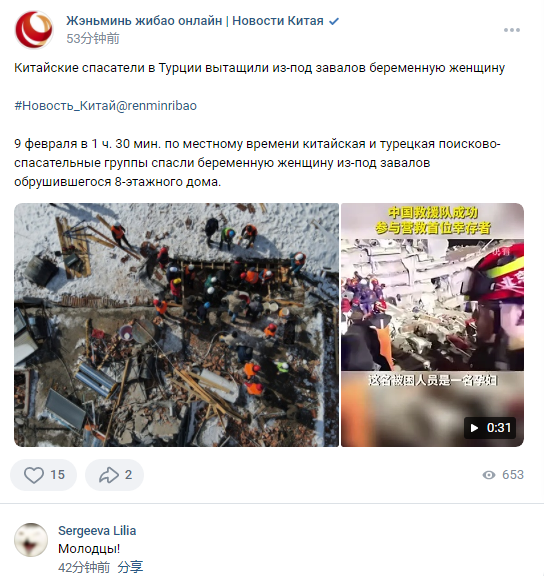 俄罗斯网友 Sergeeva Lilia就贴文《中国救援队从地震废墟中救出一名孕妇》留言:太棒了!网友Prytkov Vyacheslav 在贴文《中国救援队赶赴土耳其》留言:太棒了!灾区还有余震,多加小心!网友Dorovskikh Elena 在贴文《中国救援队抵达土耳其》留言:太棒了!俄罗斯100名救援人员也到了。