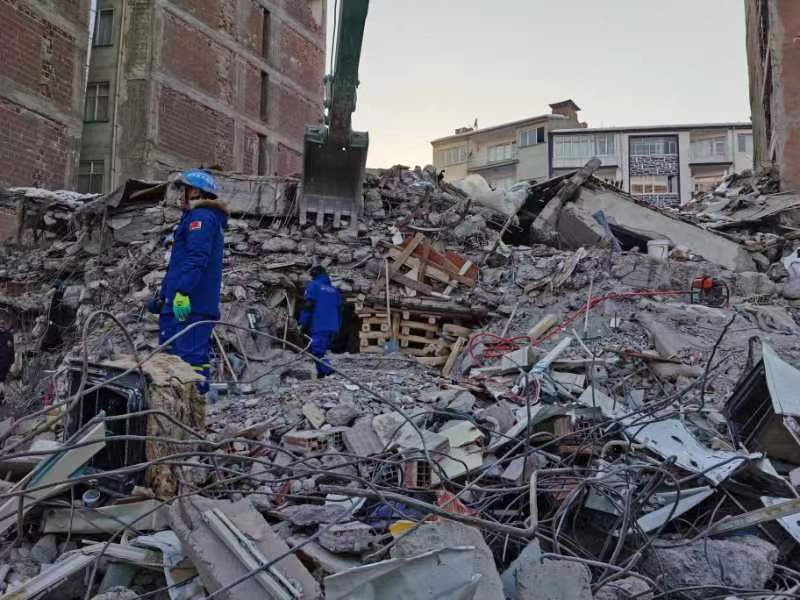 蓝天救援队在土耳其马拉蒂亚市灾区现场搜救。张昀路供图