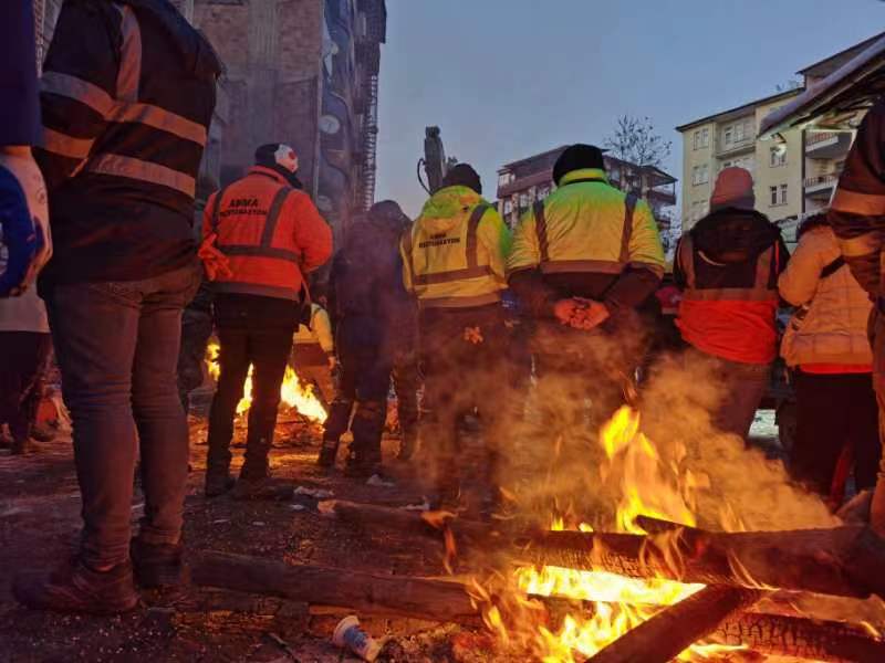 与日间救援相比,夜里开展救援的难点在于黑暗带来的视线障碍和天寒地冻下的保暖问题。夜间搜救时,会需要大量的电源供应保障照明。从倒塌的建筑物里,现场救援人员收集了一些废旧木材,燃起火堆,温暖了在深夜忙碌的每一个身影。