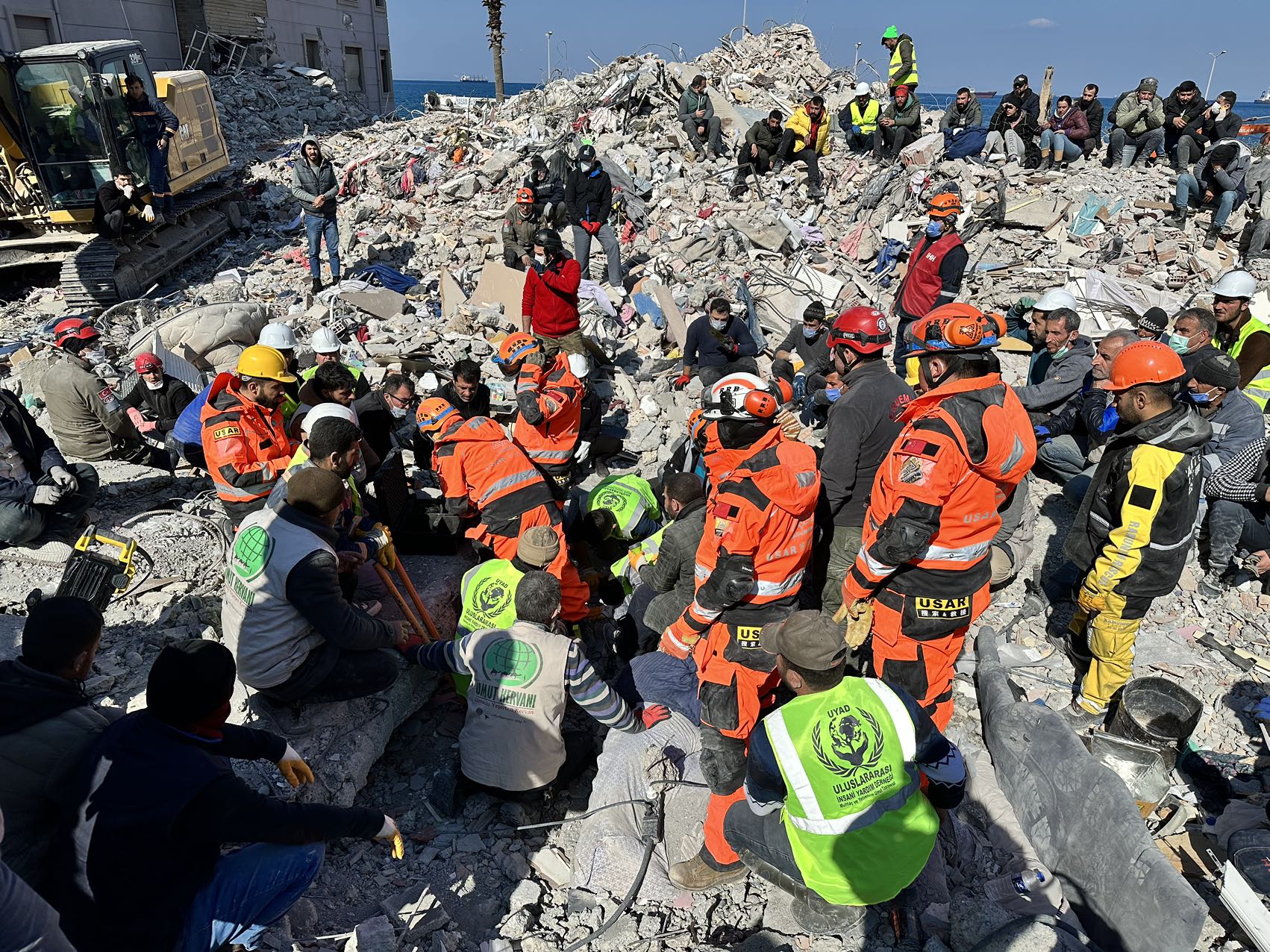 2月11日,土耳其当地时间9时许,公羊救援队接到来自伊斯肯德伦市的求救电话。电话反映,11日凌晨,在坍塌的废墟中听到有人发出声音,救援地点就在附近。所有队员集合!五分钟后出发!