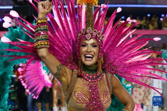 2月17日晚,在巴西里约热内卢桑巴大道,一名桑巴舞校演员参加狂欢节游行。