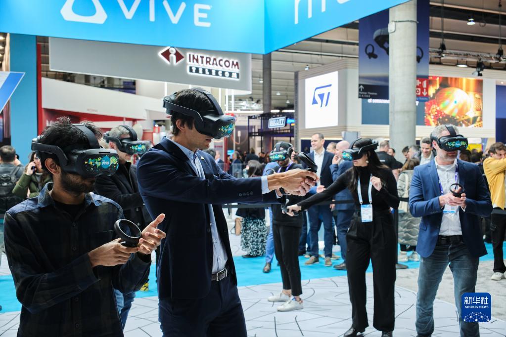 2月28日,参观者在西班牙巴塞罗那举行的2023世界移动通信大会上体验虚拟现实技术。