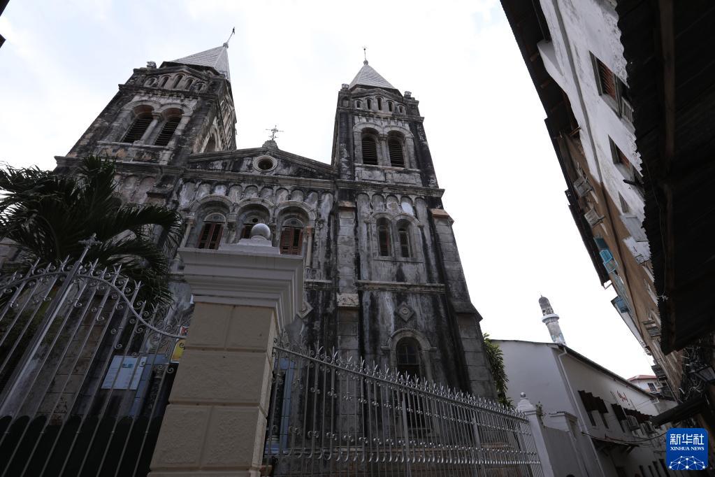 这是2月23日在桑给巴尔石头城拍摄的天主教大教堂(左)、清真寺宣礼塔(中)及民居(右)。