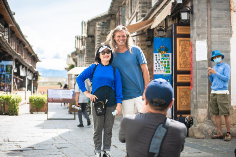 2022年8月28日,林登在喜洲古镇与游客合照。新华社记者 曹梦瑶摄