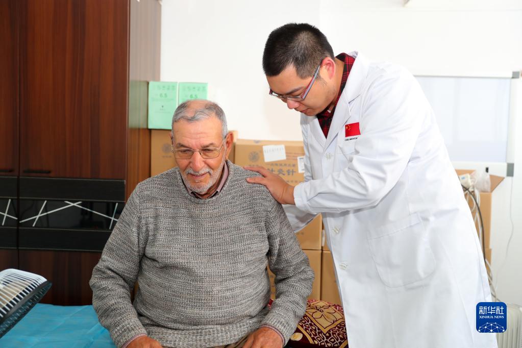 2月27日,在摩洛哥穆罕默迪耶,中国援摩医疗队的针灸医生沈含冰为一名老人做灸前检查。