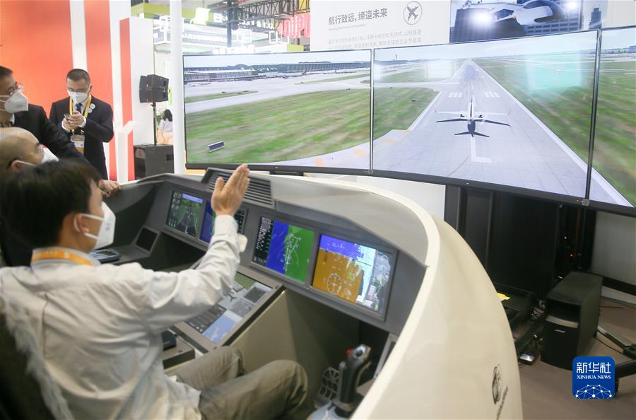 2022年11月5日,在第五届进博会技术装备展区霍尼韦尔展台,参观者在工作人员指导下体验模拟飞行。新华社记者 张可任 摄