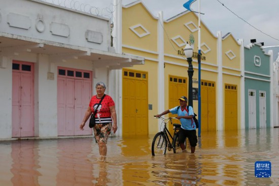 3月31日,在巴西阿克里州里奥布朗库,当地居民涉水出行。