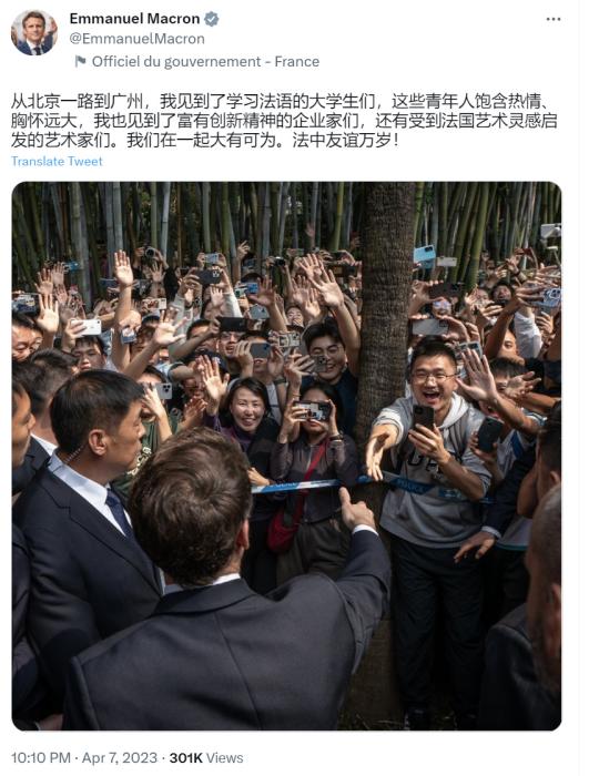 马克龙写道,“从北京一路到广州,我见到了学习法语的大学生们,这些青年人饱含热情、胸怀远大,我也见到了富有创新精神的企业家们,还有受到法国艺术灵感启发的艺术家们。我们在一起大有可为。法中友谊万岁!”