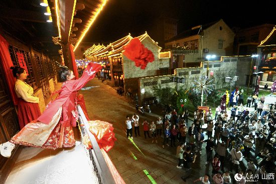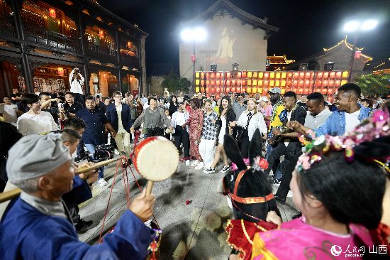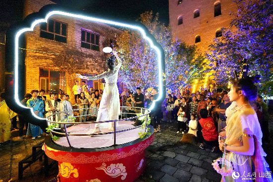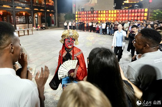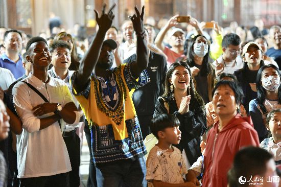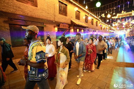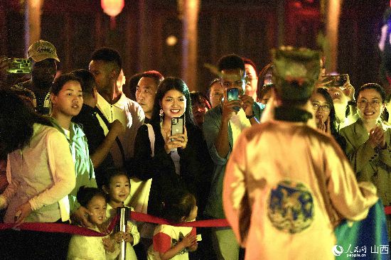 眼花缭乱的民俗表演,沉浸式的古城巡游,绚烂的城楼灯光秀,陶醉的狂欢……9月15日夜晚,在即将结束山西之行的前夜,2023“汉字缘”国际故事大会决赛的选手们夜游山西省晋城市阳城县郭峪古城,于灯火阑珊处感受古城中的人间烟火。(人民网 卢鹏宇摄)