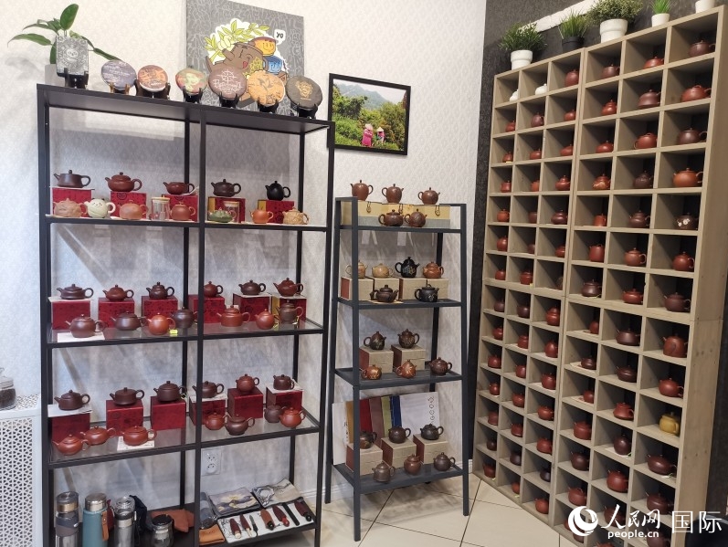 马克西姆的茶叶店摆放着来自中国宜兴、景德镇等地方的茶壶。 人民网记者 杨倩摄
