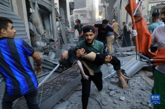 10月19日,在加沙地带南部城市汗尤尼斯,人们在遭以色列空袭后的建筑废墟中救援伤者。