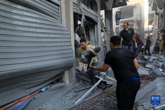 10月19日,在加沙地带南部城市汗尤尼斯,人们在遭以色列空袭后的建筑废墟中救援伤者。