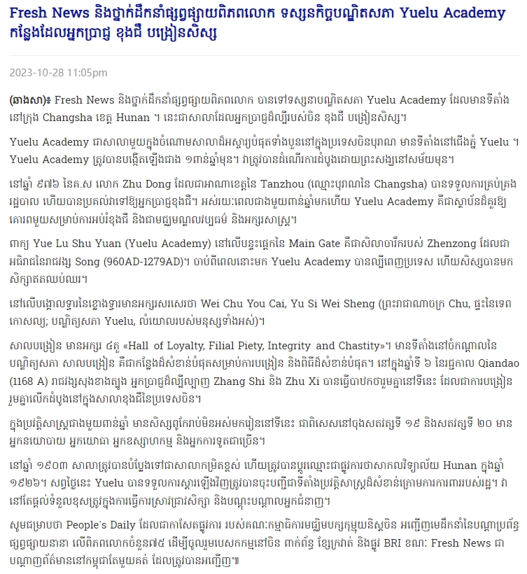 柬埔寨新鲜新闻网报道2023“一带一路”媒体合作论坛联合采访团走进岳麓书院