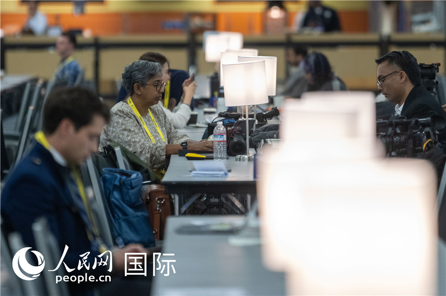 当地时间11月16日,美国旧金山,在APEC国际媒体中心,媒体记者忙碌工作。