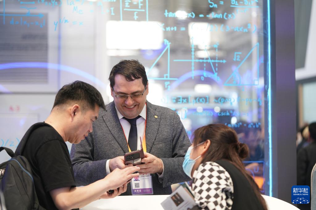 5月18日,在第八届中俄博览会展馆内,参会者(中)在拍摄展品。
