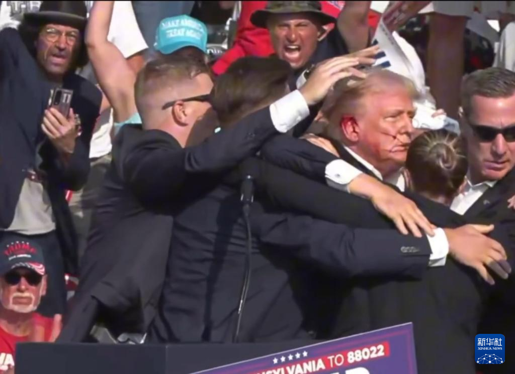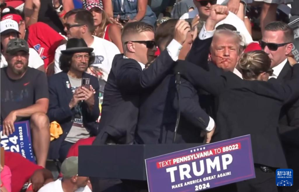 这张视频截图显示,7月13日,美国前总统特朗普在宾夕法尼亚州巴特勒市的竞选集会现场被护送离开。新华社发
