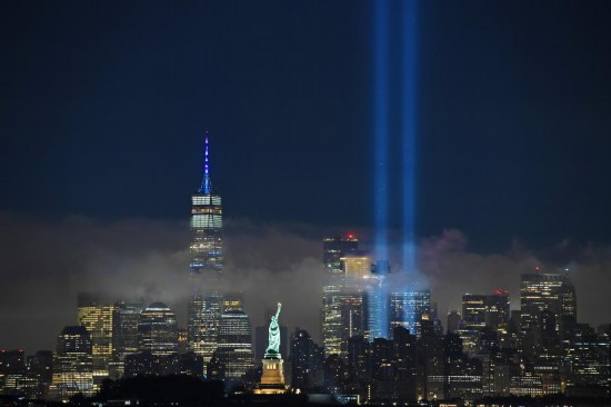 2023年9月11日晚,美国纽约世贸中心遗址附近亮起象征纽约世贸中心“双子塔”大厦的光柱,纪念“9·11”恐怖袭击事件二十二周年。新华社记者李睿摄
