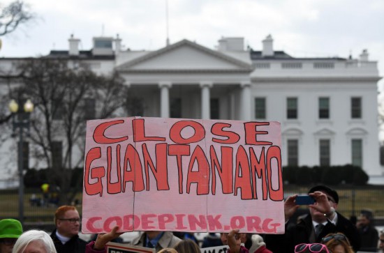 2018年1月11日,人们在美国华盛顿白宫外参加抗议活动,要求关闭关塔那摩监狱。新华社记者殷博古摄