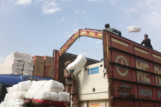 8月24日,在阿富汗首都喀布尔,工人向货车内装载货物。新华社发(塞夫拉赫曼·萨菲摄)