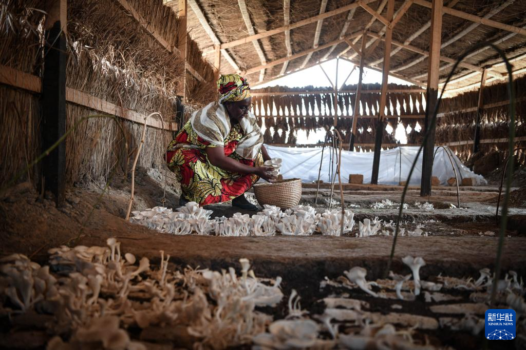 2月6日,在中非共和国达马拉,法蒂玛在菇棚内收获菌草菇。2022年,法蒂玛在听说中国菌草专家在班吉传授技术后主动前往学习,从一间小菌棚起步,逐渐扩大为如今小有名气的合作社。