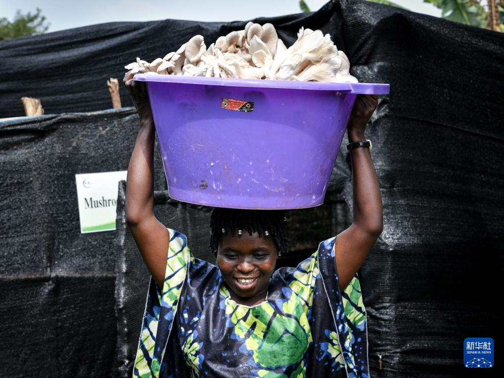 8月14日,在卢旺达南方省胡耶区,一名农民抬着采摘好的鲜菇走出菇棚。