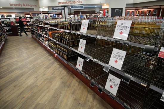 3月10日,在加拿大温哥华一家酒类专卖店内,曾摆放美国酒类产品的空货架上放置着支持购买加拿大商品的告示。新华社发(梁森摄)