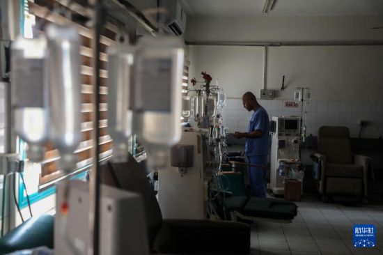 7月1日,在加沙城希法医院的透析室,一名工作人员查看设备。新华社发(里泽克·阿卜杜勒贾瓦德摄)