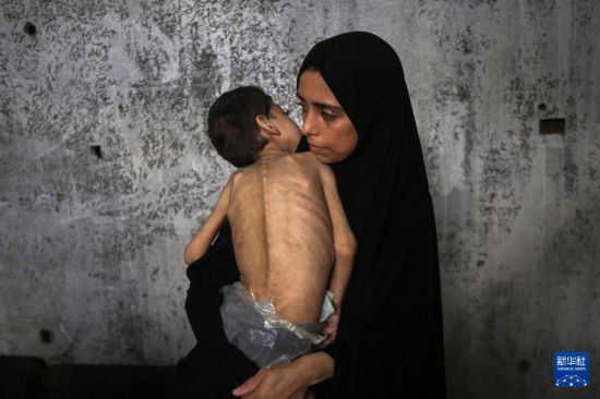7月25日,在加沙城一处避难所,一名女子怀抱营养不良并患病的儿童。新华社发(里泽克·阿卜杜勒贾瓦德摄)