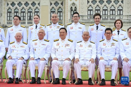 9月24日,泰国总理阿努廷·参威拉军(前中)及新一届内阁成员在位于首都曼谷的总理府合影。新华社发(拉亨摄)