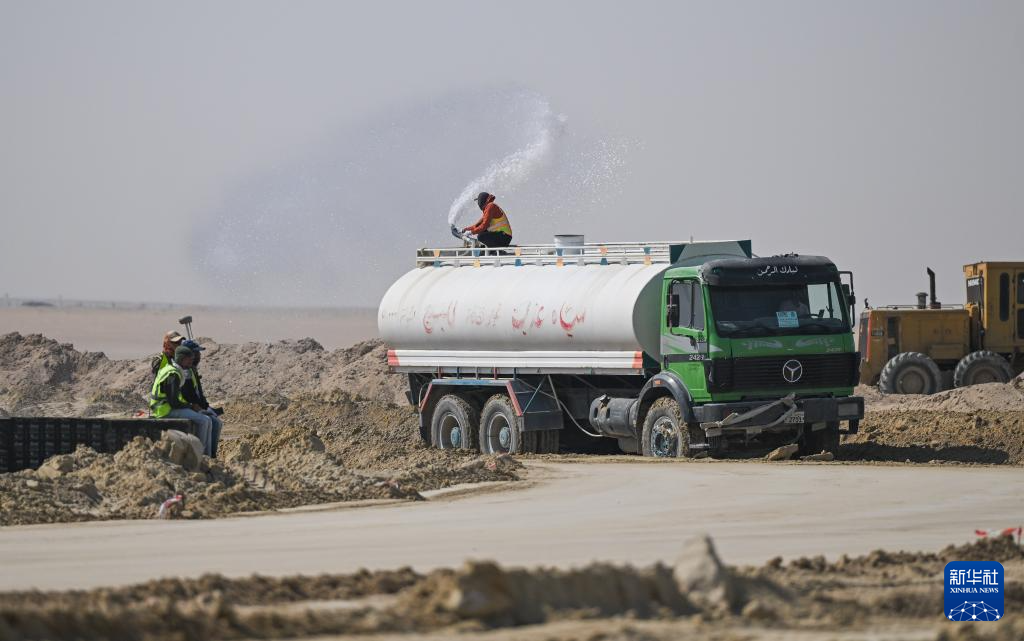 2025年11月1日,在科威特杰赫拉省,工人在南萨阿德阿卜杜拉新城基础设施项目施工现场工作。