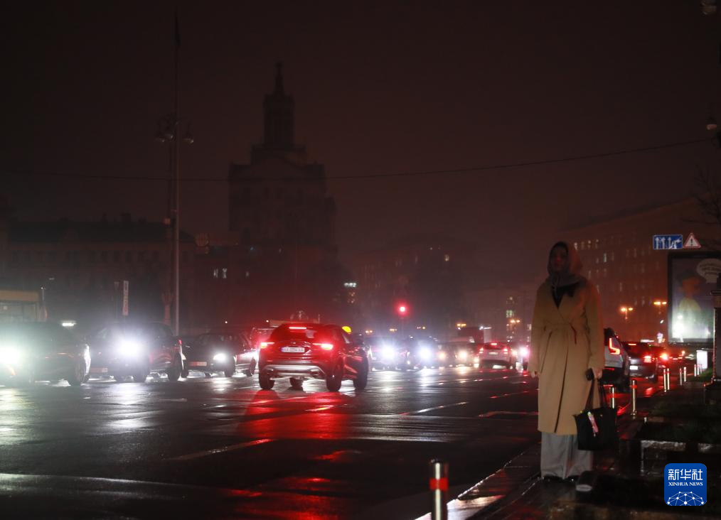 11月20日,乌克兰首都基辅主要街道的照明设施出现大面积停电,夜色中市民在路边等车。