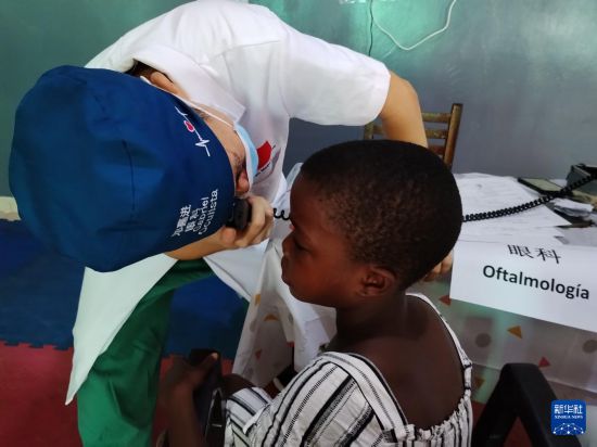 11月25日,在赤道几内亚首都马拉博一所学校,中国医疗队眼科医生为患者诊疗。