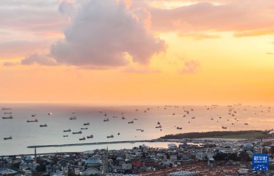 这是11月24日拍摄的停泊在土耳其伊斯坦布尔马尔马拉海上的船只(无人机照片)。