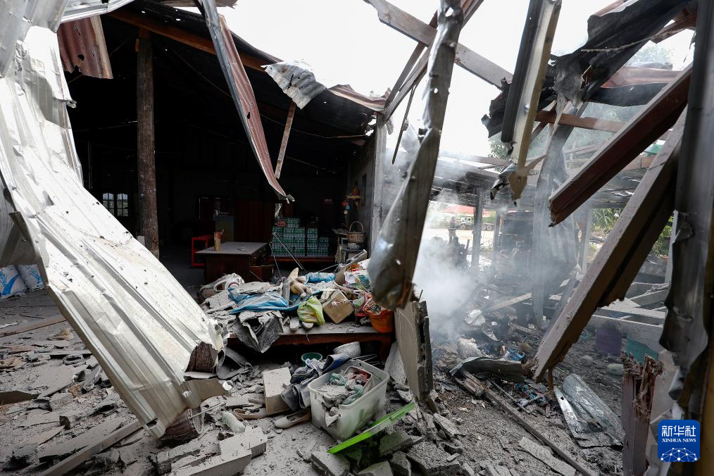 这是12月11日在泰国素林府拍摄的被炮火损毁的房屋。
