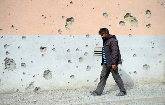 2020年9月29日,在阿塞拜疆靠近纳卡地区的塔塔尔,一名村民从布满弹孔的墙壁旁经过。新华社发(巴巴耶夫摄)