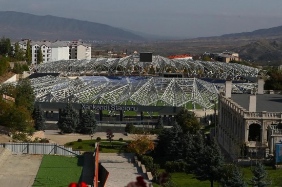 这是2025年10月15日在阿塞拜疆卡拉巴赫地区汉肯德市拍摄的建设中的汉肯德体育场。新华社记者陈俊锋摄