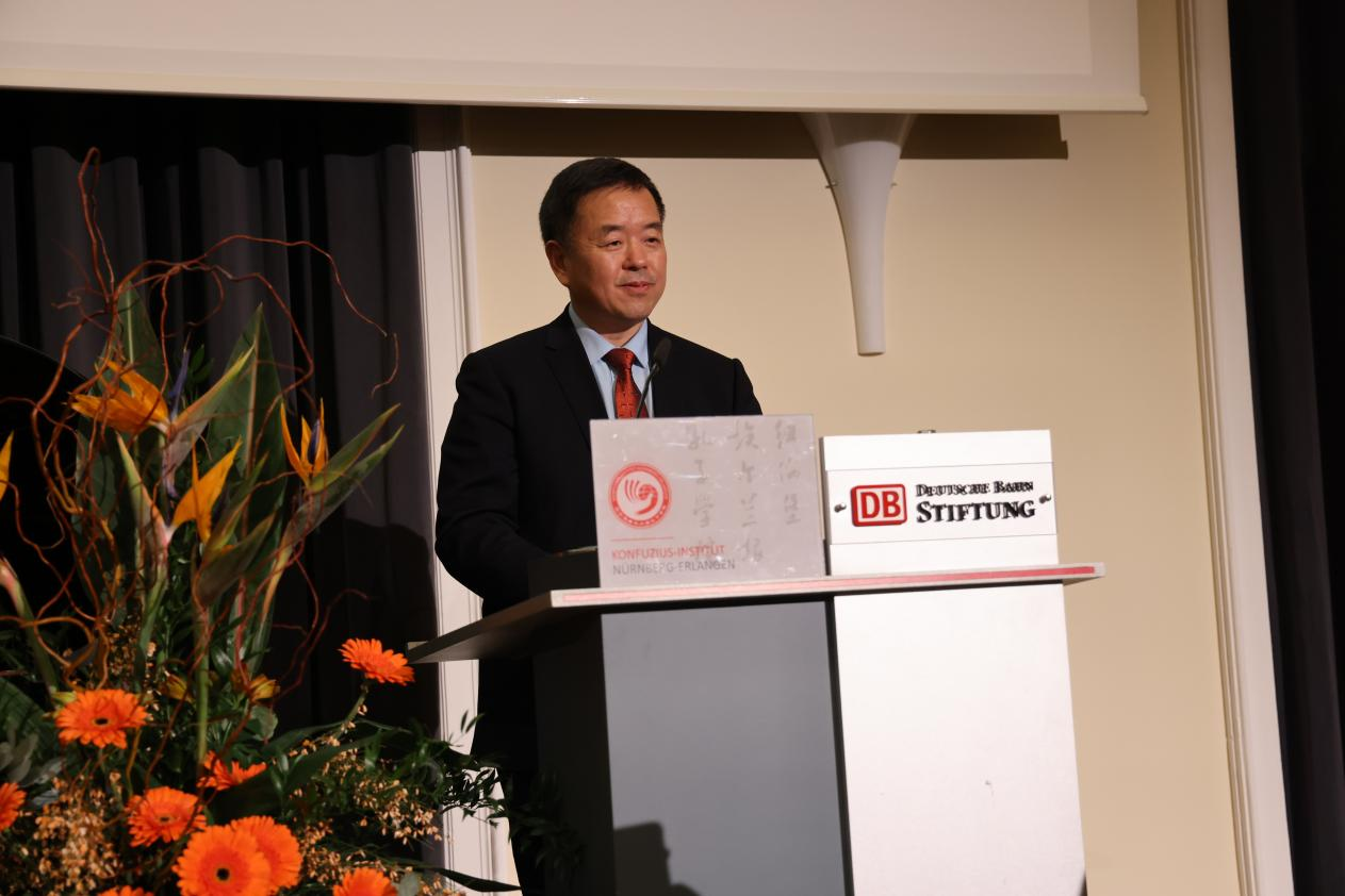 纽伦堡市长代表伯姆随后致辞指出,在全球局势复杂多变的背景下,城市层面的合作愈发显现其务实而稳定的价值。作为德国南部重要的工业与科技城市,纽伦堡长期与中国在经济、教育与创新领域保持密切往来。他表示,真正持久的伙伴关系建立在相互尊重与持续沟通之上,而纽伦堡孔院正是这一沟通网络中的重要节点。